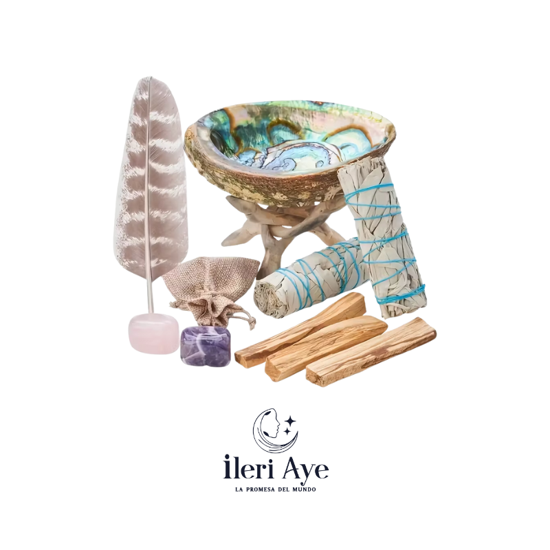 Kit con 2 cuarzos, concha, 3 palo santo, 2 sage